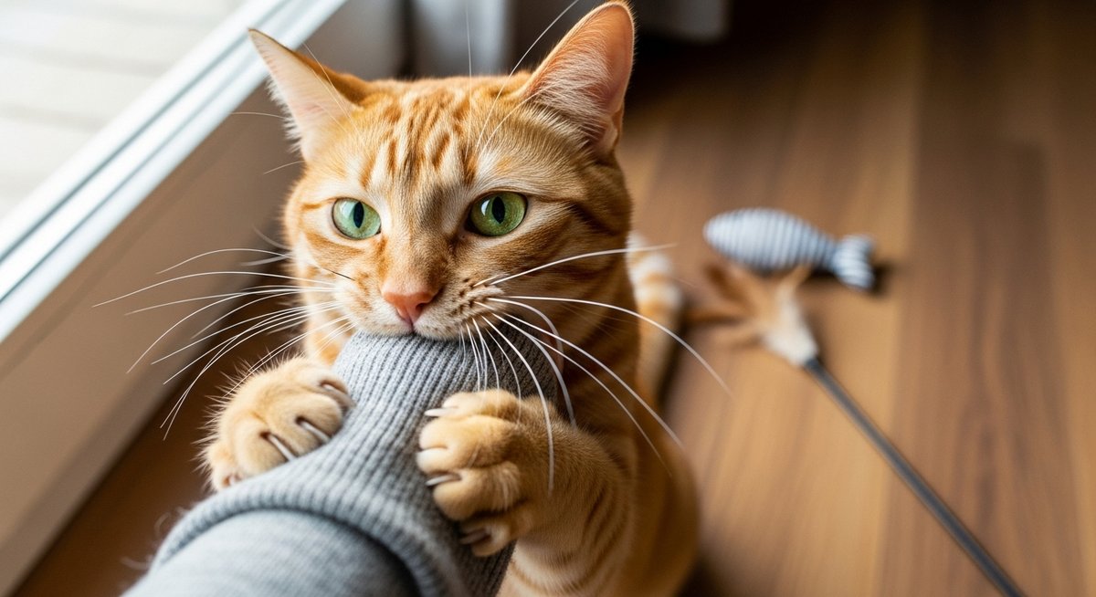 猫が腕に抱きついて噛むのは遊びや興奮が原因のことが多く、対応で落ち着きやすい