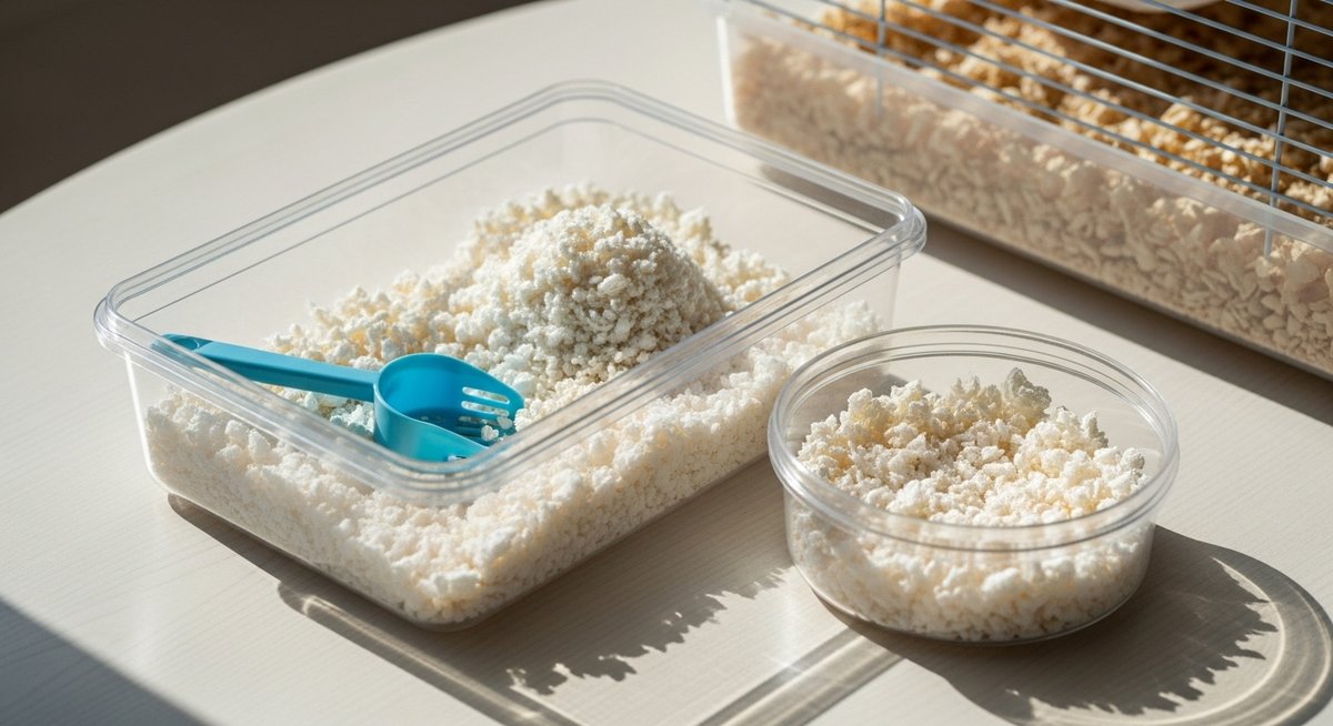 多くのハムスターは砂浴び場でトイレを済ませてしまいますが、理想的には「体をきれいにする場所」と「排泄する場所」を分けてあげるのがベストです。100均で同じ容器を2つ用意し、それぞれに違う種類の砂(トイレ砂と砂浴び用のさらさらした砂)を入れることで、場所の違いを教えることができます。